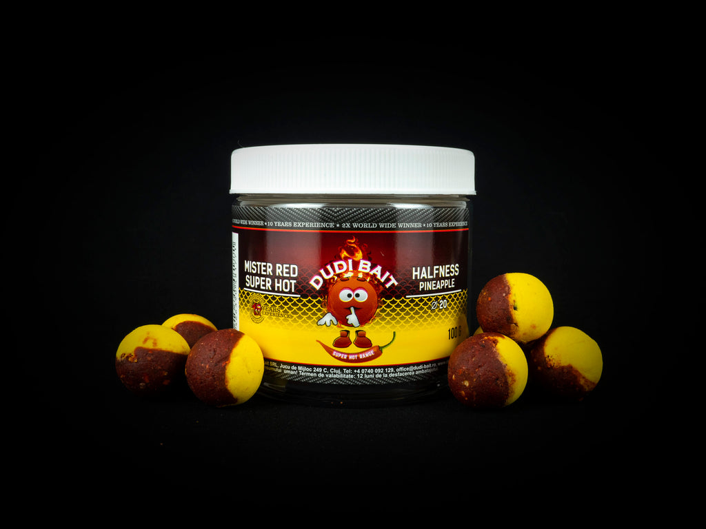 Queste esche da innesco sono metà boilies (dure) e metà pop-up. Abbiamo combinato la nostra gamma premium di boilies Mister Red "Super Hot" con una delle pop-up più efficienti che abbiamo mai prodotto: l'ananas con acido butirrico.