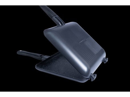 Il RidgeMonkey Connect Sandwich Toaster XL Granite Edition è dotato di maniglie rimovibili cool-touch, un sistema di cerniere staccabili che trasforma una padella in due e un set completo di utensili che si inserisce all'interno del tostapane, insieme alle maniglie, per riporlo facilmente.