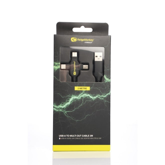 Utilizzate il cavo da USB-A a multiuscita per la vostra serie RidgeMonkey Vault. È compatibile con quasi tutti i moderni dispositivi a 5 V e ideale per l'uso a casa e in viaggio, grazie alle porte di uscita USB-C, Micro USB e Lightning. Con questo cavo è possibile collegare la porta di uscita USB-A del Vault C-Smart, il pannello solare o l'adattatore per caricabatterie da auto alla maggior parte dei moderni dispositivi a 5 V.